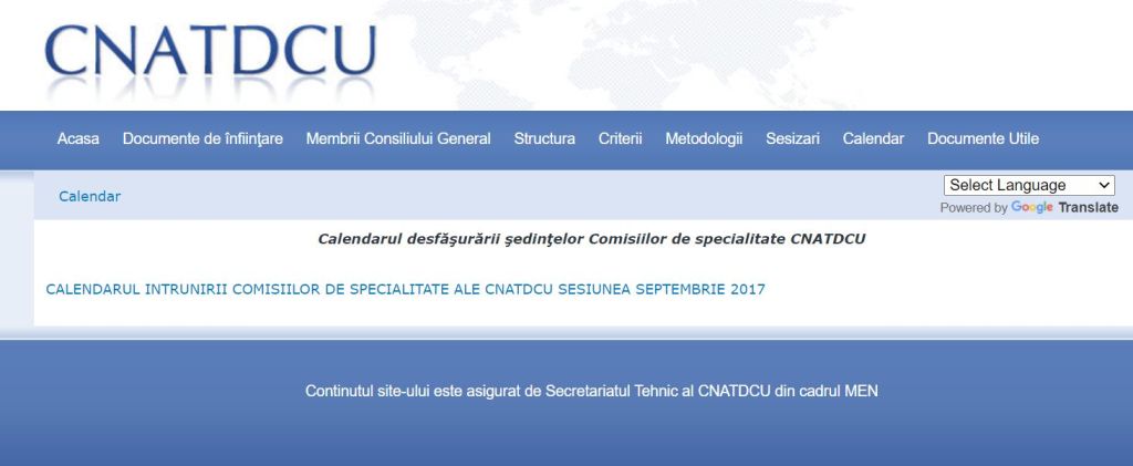 Știu, a fost și este pandemie, ceea ce – mi-a spus și doamna consilieră – a complicat puțin situațiunea. Dar aș zice că ar fi decent să nu dăm vina pentru toate cele pe Covid-19. Căci pe site-ul http://www.cnatdcu.ro/, la secțiunea „Calendar”, apare „întrunirea comisiilor de specialitate ale CNATDCU sesiunea septembrie 2017”. Da, 2017. Atît. (Vezi foto).
